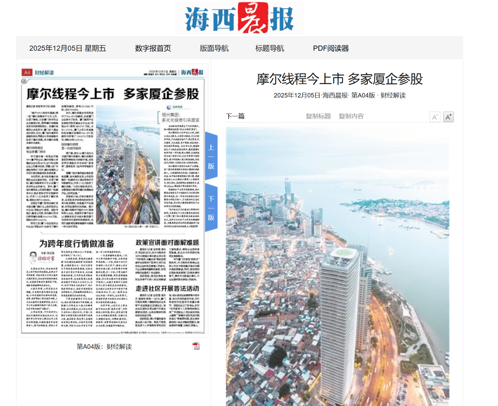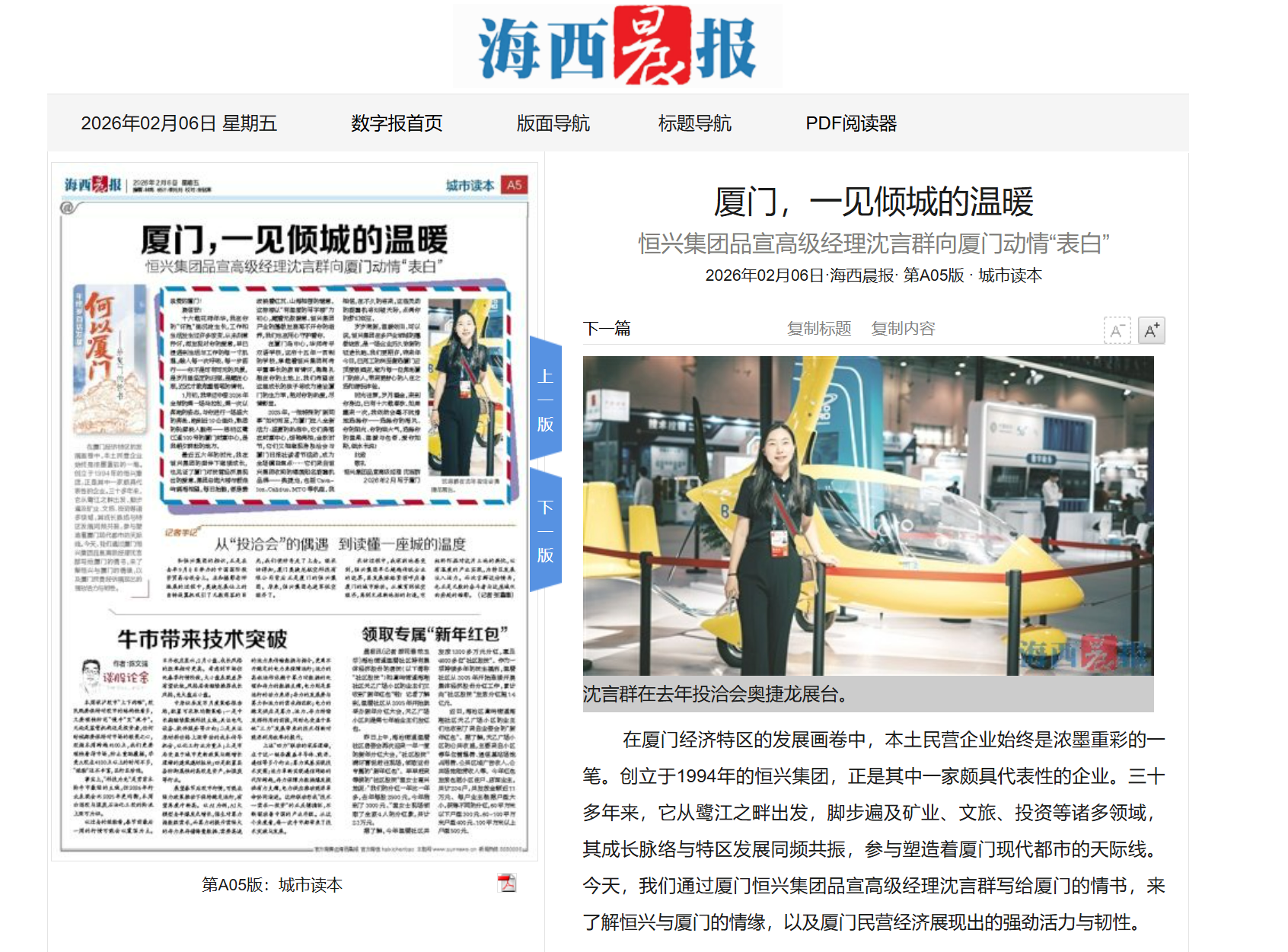 【人民政協(xié)報(bào)】2025年12月12日,人民政協(xié)報(bào)專訪柯希平文章《踩在時(shí)代的“鼓點(diǎn)”上》,刊登于第4版“委員風(fēng)采”欄目,照寧記者手記《致敬民營(yíng)企業(yè)家,致敬奮斗者》同步刊登。柯希平:第十二、十三、十四屆全國(guó)政協(xié)委員,廈門市工商聯(lián)主席,廈門恒興集團(tuán)有限公司董事長(zhǎng)。2025年11月27日,柯希平作為董事長(zhǎng)帶領(lǐng)低空經(jīng)濟(jì)知名品牌奧捷龍,參加2025亞洲通用航空展;12月3日,他以第二大股東身份,出席廈門奧普拓自控科技有限公司股東董事交流會(huì);12月5日,他以投資人身份,出席“國(guó)產(chǎn)GPU第一股”摩爾線程的上市敲鐘儀式……在新質(zhì)生產(chǎn)力賽道加速布局并收獲頗豐的柯希平,在接受記者采訪時(shí)樸實(shí)地說(shuō):“作為農(nóng)民的兒子,創(chuàng)業(yè)30多年來(lái),我走對(duì)的每一步,都是因?yàn)榫o跟了國(guó)家經(jīng)濟(jì)命脈的跳動(dòng)?!睆募缣艮r(nóng)產(chǎn)品“趕集”,到如今的商業(yè)版圖涵蓋冶金礦產(chǎn)、商業(yè)貿(mào)易、民辦教育、文化旅游、資產(chǎn)管理、股權(quán)投資等多個(gè)領(lǐng)域,柯希平的經(jīng)歷正是改革開(kāi)