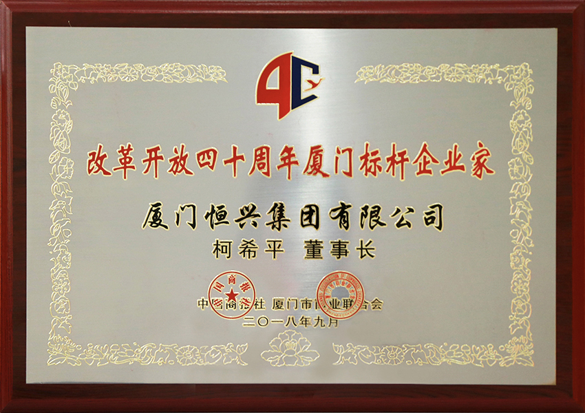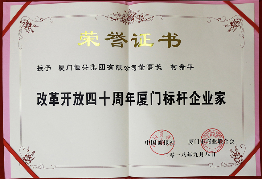 金秋迎盛會(huì),改革促發(fā)展。9月8日,在第二十屆中國(guó)國(guó)際投資貿(mào)易洽談會(huì)開(kāi)幕之際,中國(guó)商報(bào)社、廈門(mén)市商業(yè)聯(lián)合會(huì)攜手主辦的“改革開(kāi)放四十周年廈門(mén)標(biāo)桿企業(yè)家、創(chuàng)業(yè)精英、助力品牌、創(chuàng)新品牌”推選活動(dòng)在廈門(mén)舉行頒獎(jiǎng)儀式,61家企業(yè)家和品牌獲得殊榮。廈門(mén)恒興集團(tuán)柯希平董事長(zhǎng)榮獲“改革開(kāi)放四十周年廈門(mén)標(biāo)桿企業(yè)家”榮譽(yù)稱(chēng)號(hào)。