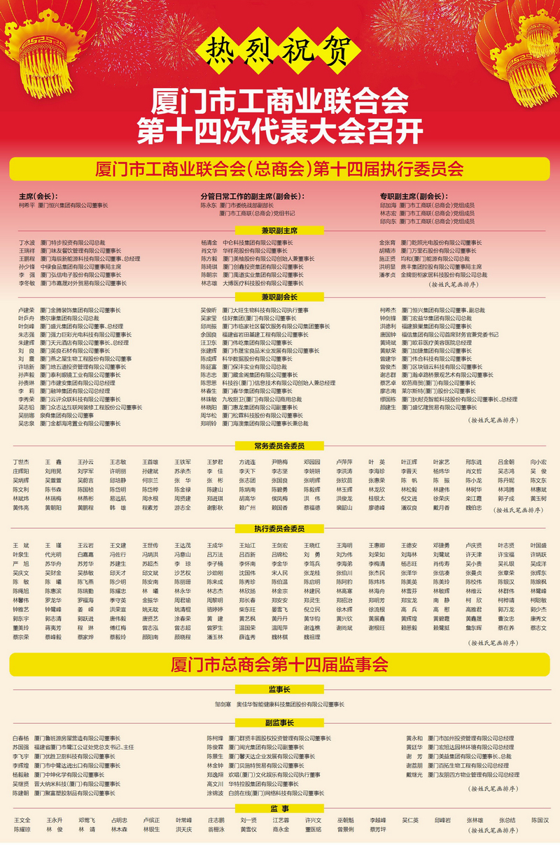 會議選舉產(chǎn)生廈門市工商業(yè)聯(lián)合會(總商會)第十四屆執(zhí)行委員會、廈門市總商會第十四屆監(jiān)事會組成人員,恒興集團董事長柯希平連任主席(會長),奧佳華集團董事長鄒劍寒當(dāng)選監(jiān)事長。